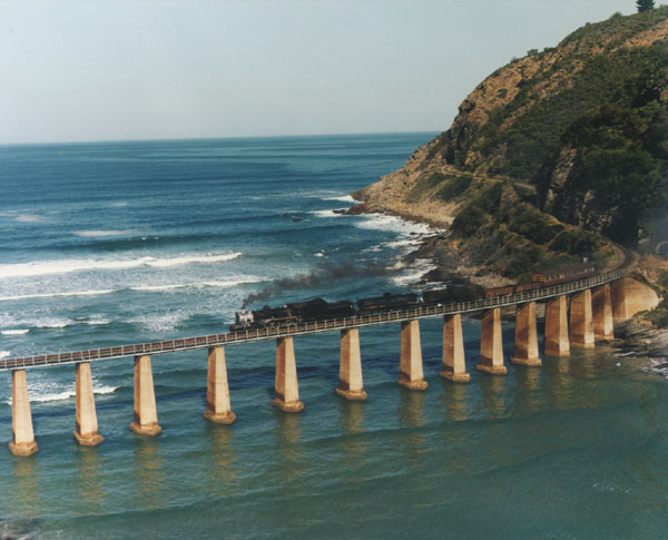 | South African Railways 2-8-4 Class 24 on the George-Knysna Line along the Indian Ocean near Wilderness July 1984. This is the famous Kaimann's River Bridge, where the river empties into the Indian Ocean. This mixed train is headed for Knysna, and will return later in the afternoon with loads of stinkwood, a principle source of revenue on the line. This line was designated as a steam heritage line in South Africa, even after all regular lines in the country were deiselized. However, just recently in 2000, diesels seem to have taken over most of the duties, with only special trains being steam hauled from the steam center of George. |