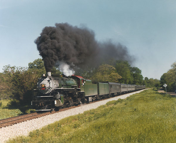 | Southern Railway 2-8-2 #4501 nears Memphis, Tennessee in April 1985. The nex weekend 4501 would run a pair of roundtrip excursions from Memphis to Iuka, Mississippi. The Norfolk Southern Steam program was terminated in 1994, but 4501 may still operate in the future since it is owned by the Tennessee Valley Railway Museum in Chattanooga. |