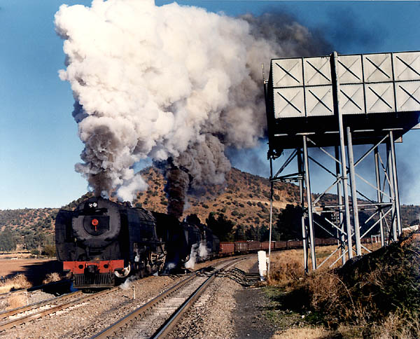 | A pair of South African Railway Class 25NC 4-8-4's are doubleheading a freight headed from Kimberly to Bloemfontaine in the the Orange Free State, of South Africa. They have just met another train, and are departing Kloofiend a station about 30 miles from Bloemfontaine. Our morning visit in July 1984, resulted in about 6 trains within 90 minutes all steam! |
