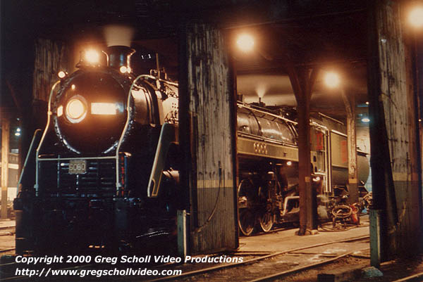 | Canadian National 4-8-2 #6060 waits patiently in the CN Spadina Roundhouse in Toronto prior to operating a roundtrip from Toronto to Gravenhurst in September 1975. Looking at this night shot it is hard to tell if it is 1955 or 1975. Now 6060 is run by the Rocky Mountain Rail Society, and has operated recently on the Alberta Prairie Railroad in Alberta. |