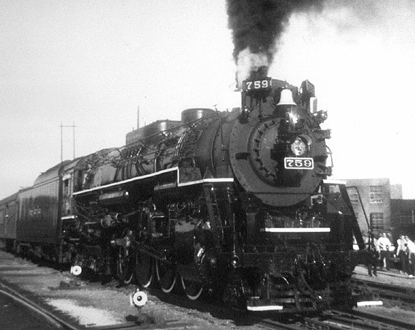 | Black and White Photo, Nickel Plate Road 2-8-4 #759 at Conneaut, Ohio on its first trip in 1968. Ross Rowland leased the engine for his HIGH IRON COMPANY, from Steamtown and the engine was legendary until 1973, when it was returned to Steamtown. Shortly before this photo the champaign bottle was broken over the coupler, before the engine hauled the train eastward. |