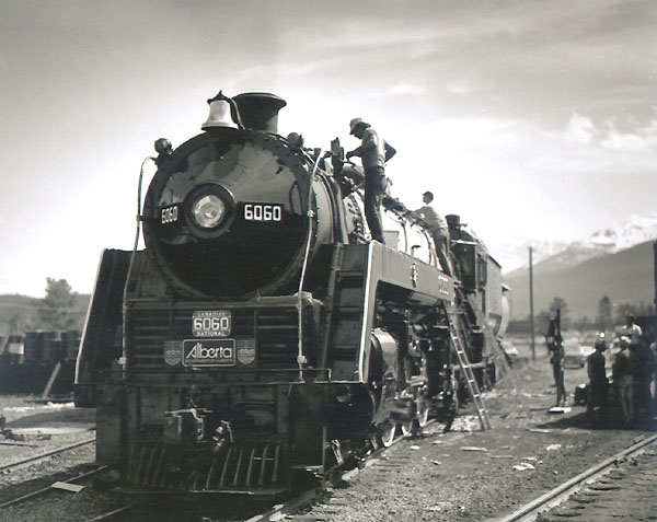 | Another black and white view of CN 6060 in Jasper being steamed-up in May 1986. We volunteered to work on the engine for part of the 10 days we spent there awaiting it's return to service. Time was so short, that the boiler jacket was barely in place before the train was steamed-up, and the jacket was never painted, operating in primer grey all the way to Vancouver on a freight. |